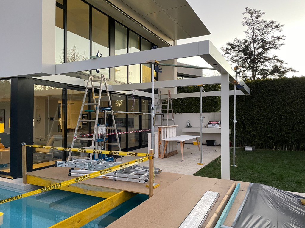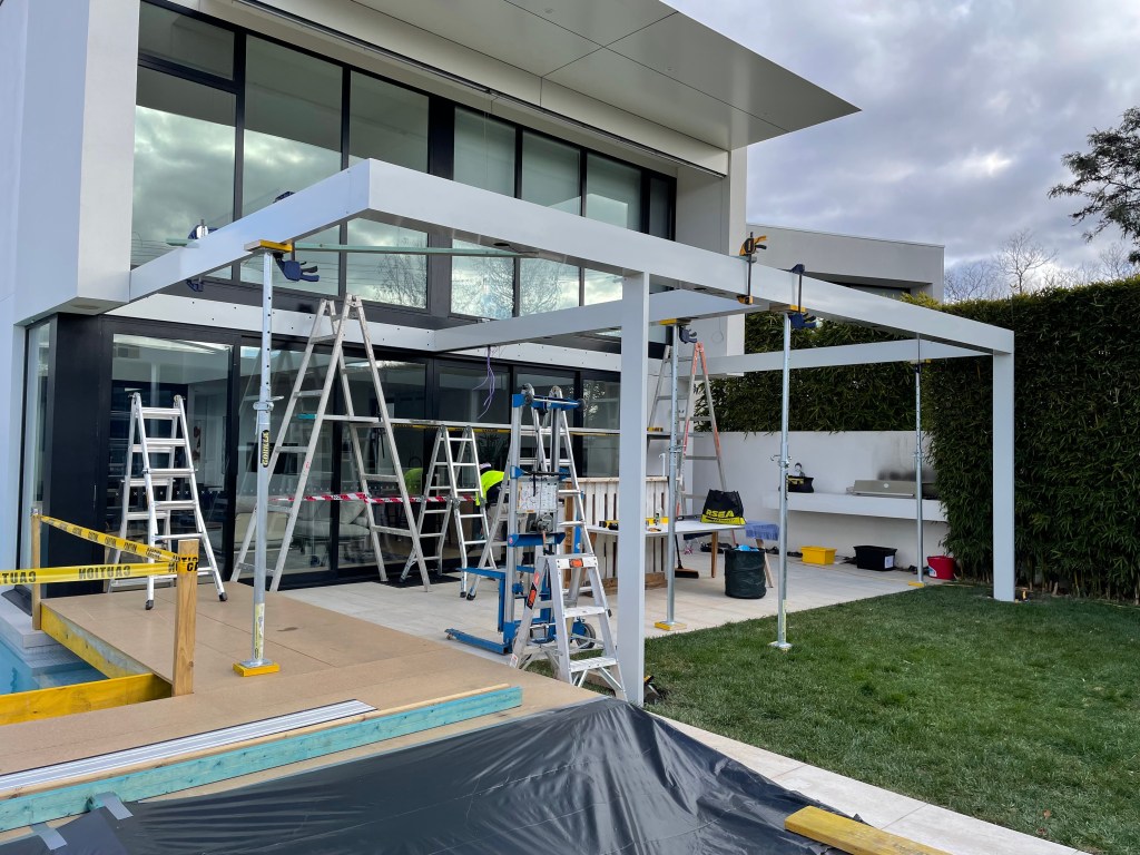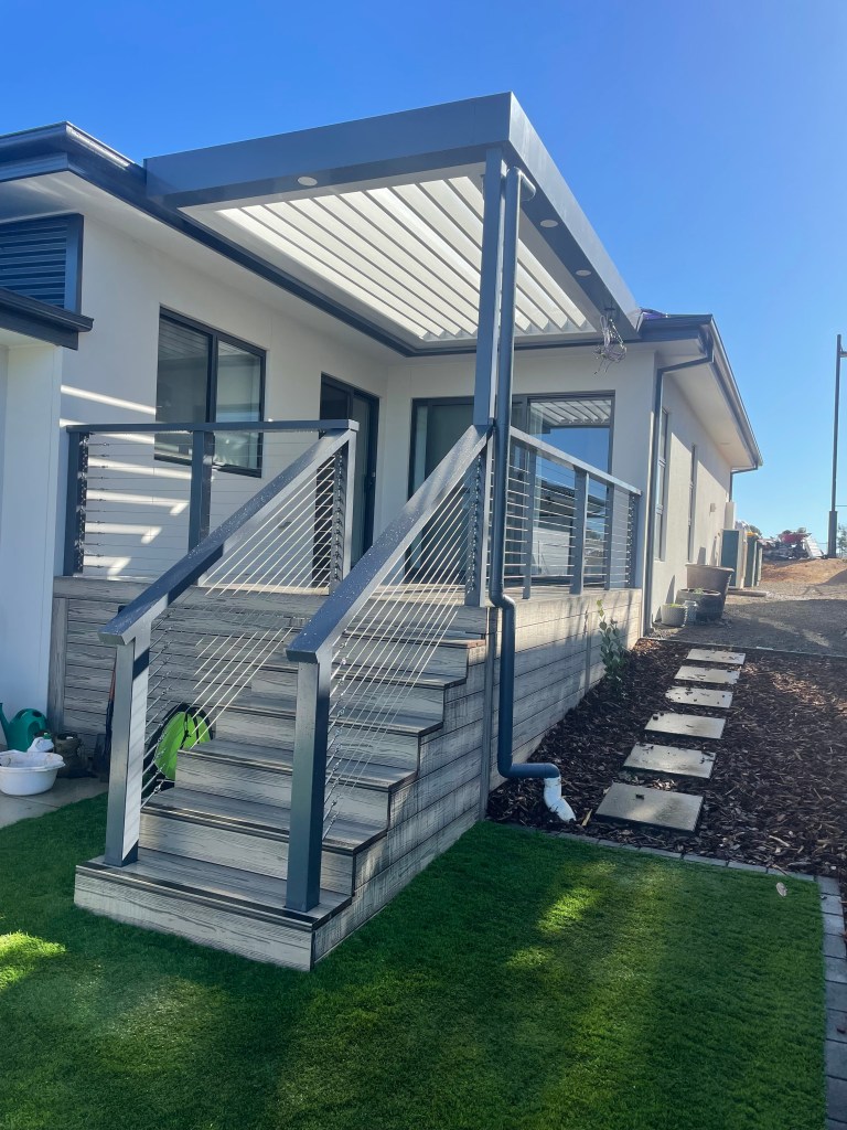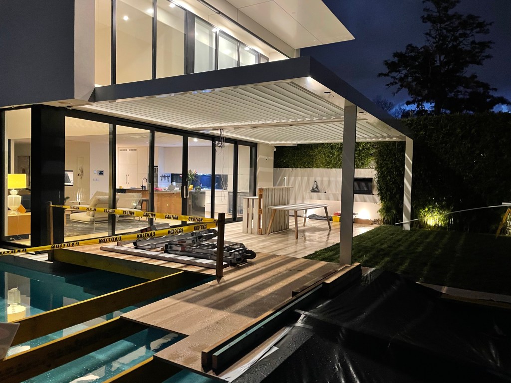 Construction of a composite decking system and installation of an automated open–close louvre roof for a newly built home.