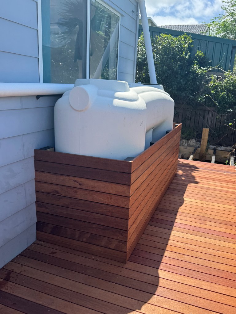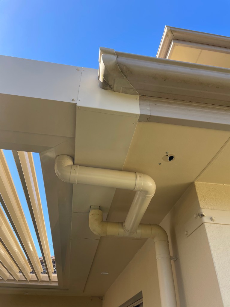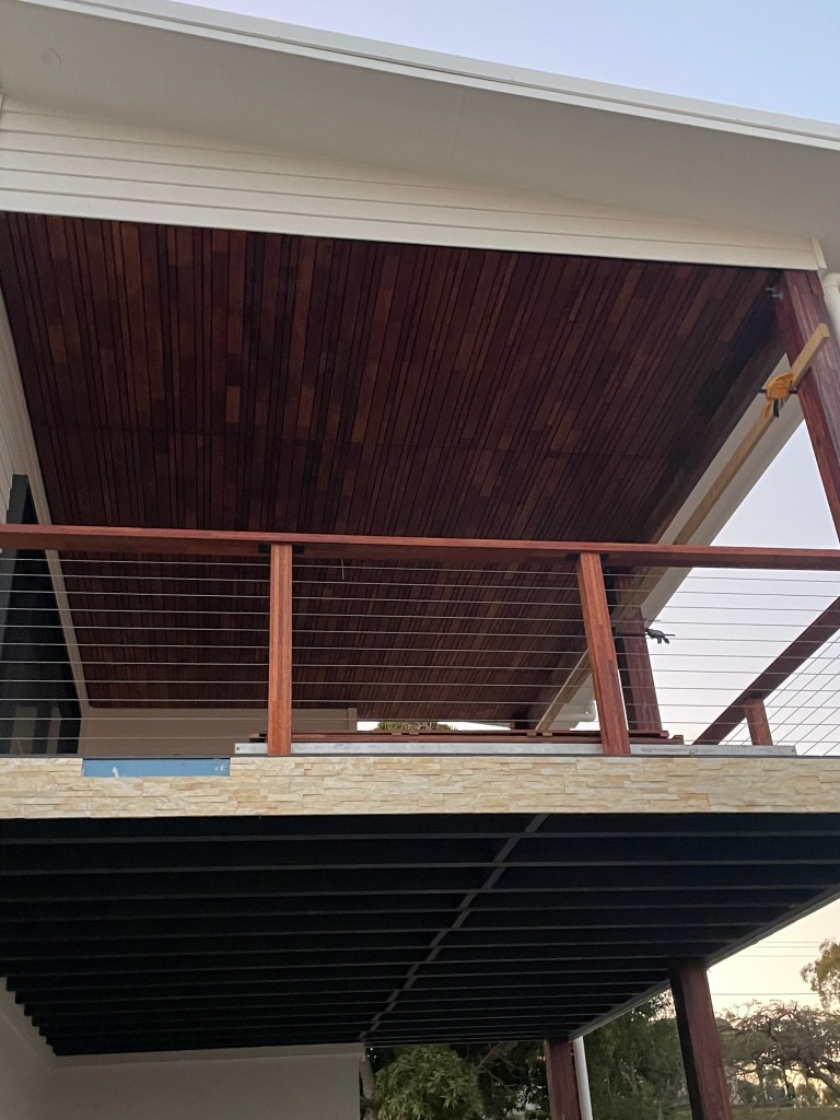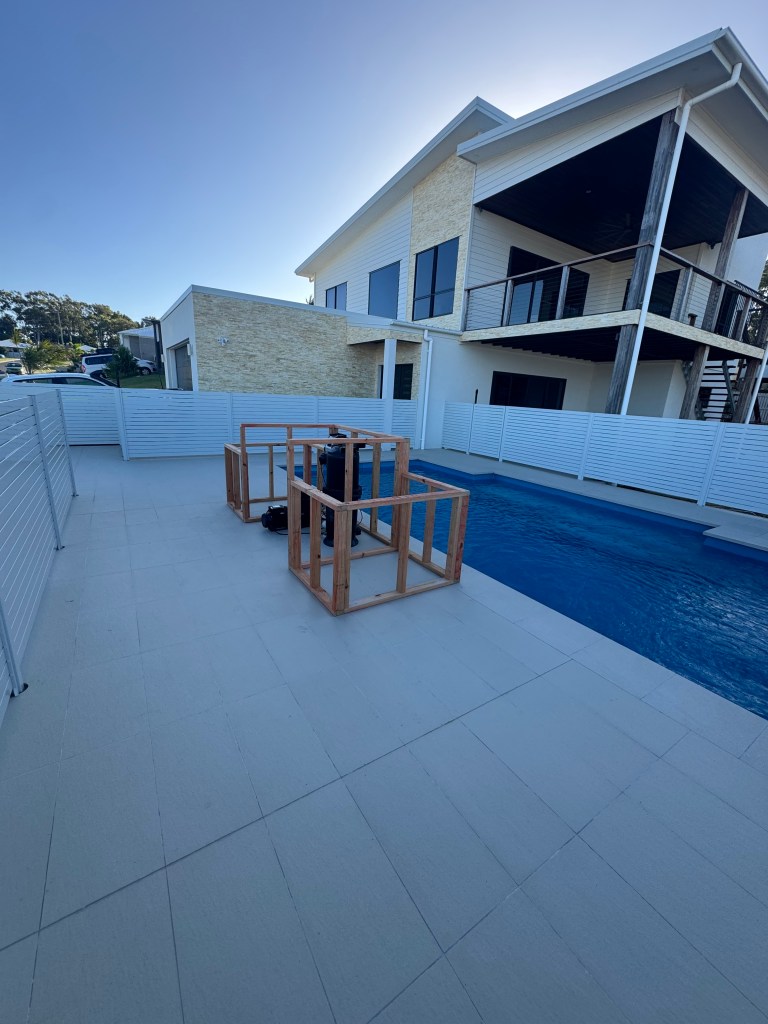 Construction of a composite decking system and installation of an automated open–close louvre roof for a newly built home.