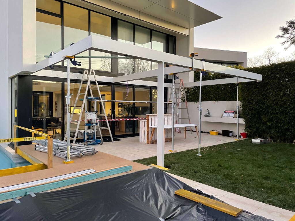 Included structural framing, precise levelling, stainless fixings, custom bracket placement and integration with the existing outdoor architecture.