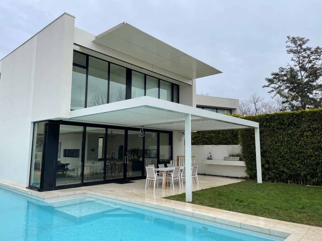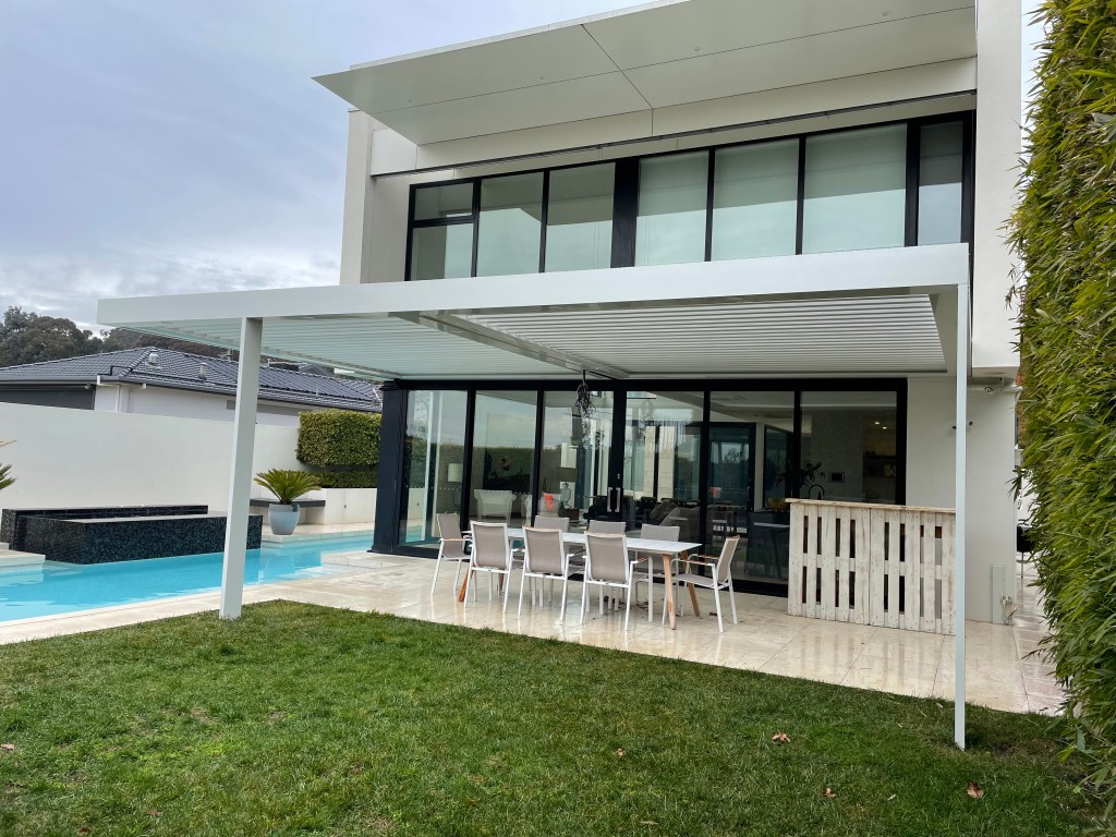 Supply and installation of a dual-bay automated louvre roof structure for a high-end outdoor entertaining area.